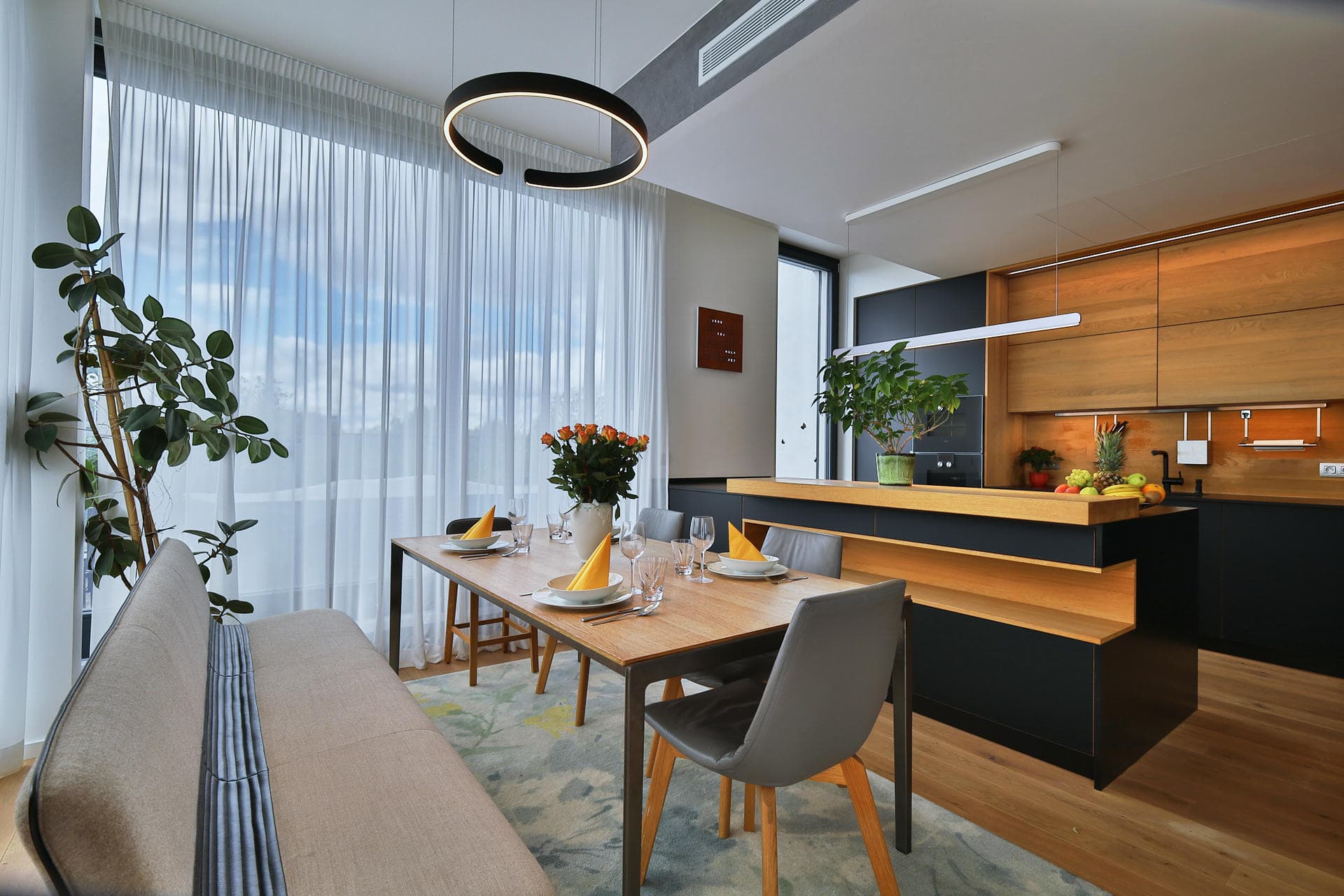 Tento prodávaný penthouse se může pochlubit velkorysou dispozicí zahrnující prostorný obývací pokoj s kuchyní a jídelnou, čtyři ložnice, dvě luxusní koupelny a samostatnou toaletu. Každá místnost je promyšleně propojena s venkovními terasami, umožňující plynulý přechod mezi interiérem a exteriérem.